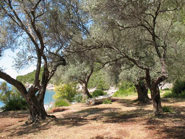 Вот они, оливковые рощи Луштицы! Старые деревья с серебристой листвой и узорчатой корой, будто бы сплетенной из множества полосок. Почва под ногами красноватого оттенка, мягкая, усыпанная опавшими листьями и маслинами. Вы когда-нибудь ходили по падалице маслин? – Нет… А здесь этот драгоценный продукт буквально валяется под ногами.