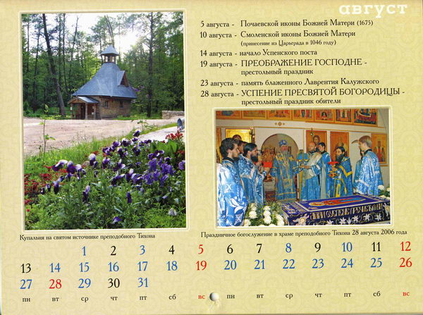 По заявкам творческой интеллигенции, привожу здесь сканы нескольких листов календаря, который продавался в иконной лавке Тихоновой пустыни в этот раз.