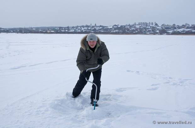 Расчистите лед от снега. Встаньте правым боком к Горицкому монастырю и просверлите во льду отверстие.