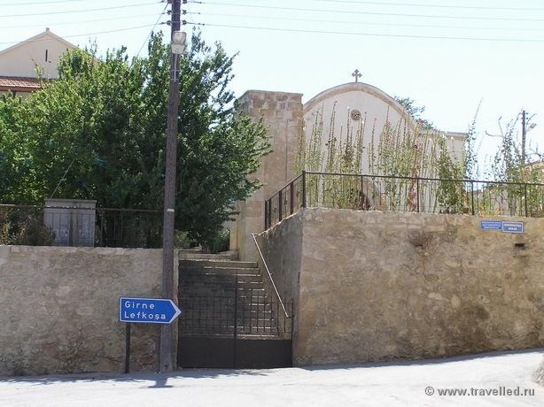 Мы зашли немного посидеть в кафе рядом с церковью и попить чаю. Чай нам принесли в огромных чашках, он был заварен на каких-то травах, очень необычный вкус. Отсюда же была видна обычная греческая церковь, тоже действующая, и указатель поворота на основную трассу до Гирне и Лефкоши, куда мы потом и поехали.